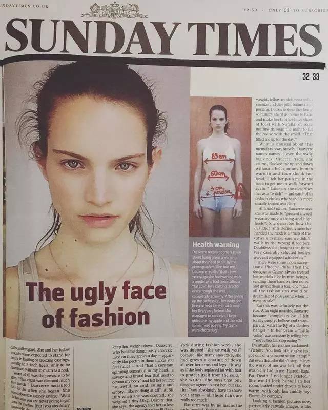 “得了厭食癥以后的我頭發(fā)不斷脫落,月經(jīng)也停止了,經(jīng)常暈倒,還有嚴(yán)重的抑郁癥!我只有23歲,但醫(yī)生說(shuō),我的皮膚狀態(tài)大約在50歲,骨骼年齡更是和70歲的老太太相當(dāng)!”“我的大部分模特好友都因?yàn)殚L(zhǎng)期服用減肥藥物已經(jīng)不孕育了,每當(dāng)看到鏡子里骨瘦如柴的自己,我都無(wú)比討厭自己的身體!