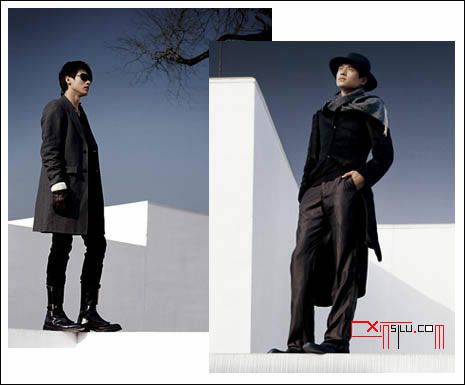 左圖:風(fēng)語者-綠色呢子大衣/Agnes b 黑色絲質(zhì)雪紡襯衣/Gucci 灰色呢料馬甲/Agnes b 黑色緊身長(zhǎng)褲/ Gucci 黑色腰帶/Versace 棕色針織羅口手套/Agnes b 黑色軍靴/Versace 墨鏡/Versace