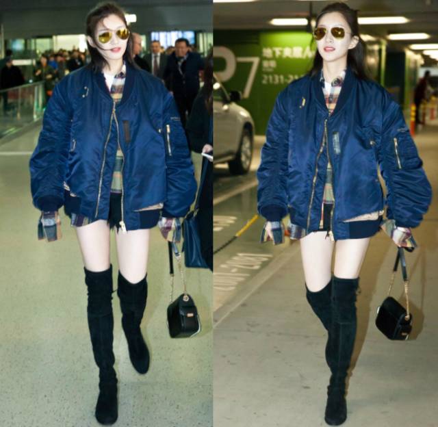 看到袁姍姍這兒,嗒嗒懷疑oversize飛行員夾克、短褲是不是已經成了長靴的標配,中國的女明星,都要走女特工路線了么?